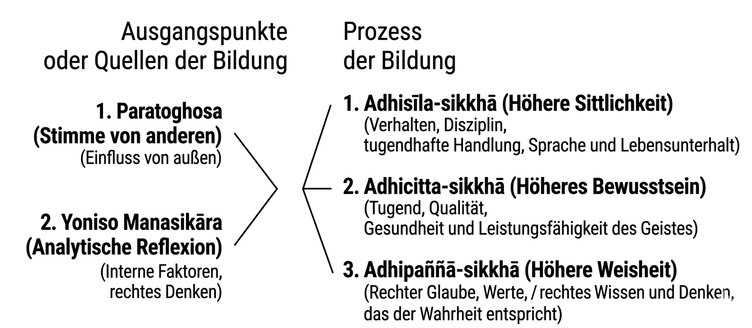 GRAFIK: Schaubild „Ausgangspunkt und Prozess der Bildung“: Links zwei Ausgangspunkte (1. Guter Paratoghosa / äußerer Einfluss, 2. Yonisomanasikāra / richtiges Denken, innere Bedingung), rechts drei Stufen des Bildungsprozesses (1. Adhisīlasikkhā: Verhalten, Disziplin, Aufrichtigkeit in Körper, Rede und Beruf; 2. Adhicittasikkhā: Tugend, Qualität, Gesundheit und Leistungsfähigkeit des Geistes; 3. Adhipaññāsikkhā: Überzeugungen, Wertvorstellungen, Wissen und Denken, die richtig, gut und wahrheitsgemäß sind)