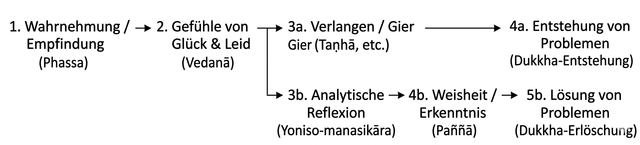 Die Haltung und die Reaktion einer Person beim Wahrnehmen dieser Objekte (ārammaṇa) hat höchst bedeutsame Auswirkungen auf ihr Seelenleben und ihren Lebensweg. Wenn sie mit einer Haltung des Gefallens und Missfallens oder der Zu- und Abneigung wahrnimmt, setzt sich der Kreislauf der Probleme in Gang. Nimmt sie hingegen mit der Haltung des Datenerfassens wahr, sieht die Dinge so, wie sie wirklich sind, und betrachtet sie nach ihren Ursachen und Bedingungen, so führt dies zu Weisheit (paññā) und zur Lösung von Problemen.