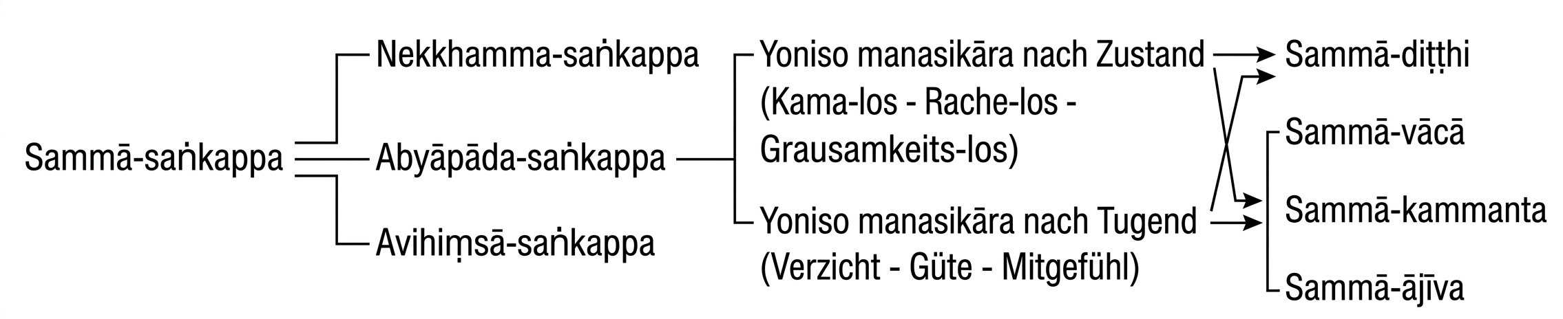 GRAFIK: Verzweigungsdiagramm: Sammāsaṅkappa mit den drei Ästen Nekkhammasaṅkappa, Abyāpādasaṅkappa, Avihiṃsāsaṅkappa, die sich nach links über Yonisomanasikāra (Betrachtung nach Sabhāva / Anregung von Kusala) zu den Pfadgliedern Sammādiṭṭhi, Sammāvācā, Sammākammanta verzweigen