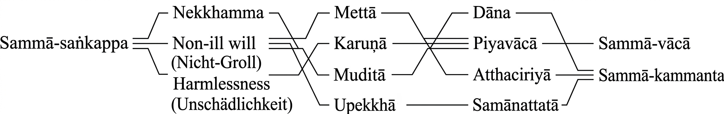 GRAFIK: Verzweigungsdiagramm: Sammāsaṅkappa mit den drei Ästen Nekkhammasaṅkappa, Abyāpādasaṅkappa, Avihiṃsāsaṅkappa, die sich nach rechts über Mettā/Karuṇā/Muditā/Upekkhā (Brahmavihāra) und Dāna/Piyavācā/Atthacariyā/Samānattatā (Saṅgahavatthu) zu den Pfadgliedern Sammāvācā und Sammākammanta verzweigen